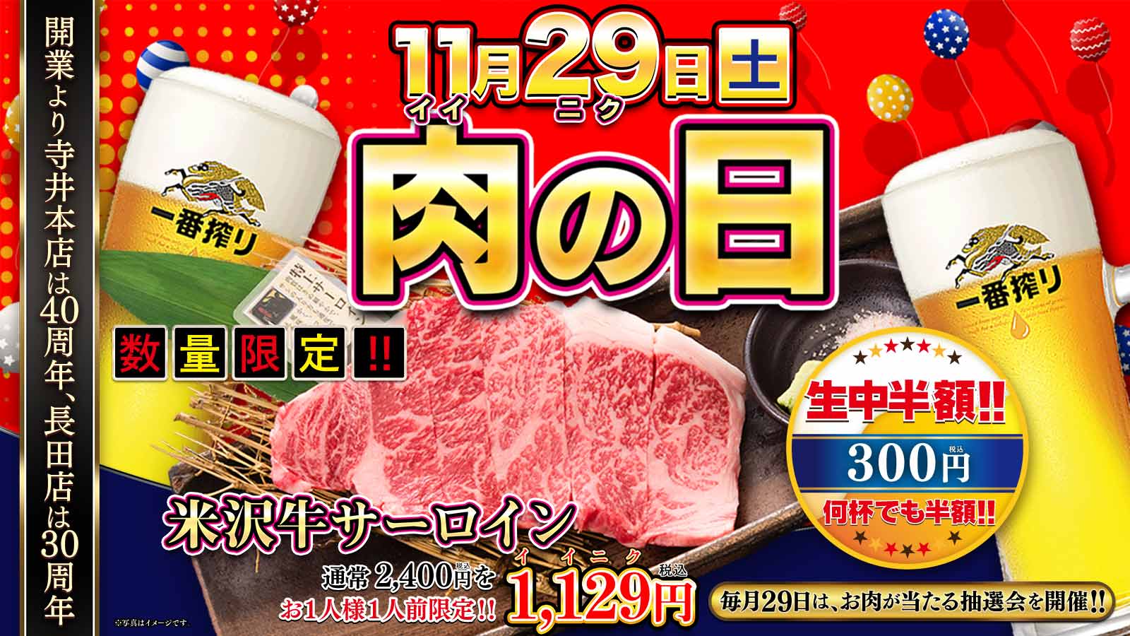 【11月29日土曜日】周年を記念して、お得な肉の日を開催