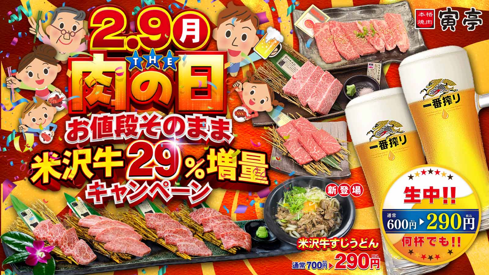 【2月9日月曜日】お得な肉の日 投稿者: 寅亭2026年1月30日2026年1月30日寺井本店 米沢牛29%増量キャンペーン!! 2月9日月曜日は、お得な肉の日!お値段そのままで米沢牛を29%増量してご提供させて頂きます!!さらに生中を290円で飲めます。新メニューの米沢牛すじうどんもご用意。今回は290円でご提供させて頂きます。ぜひこの機会にご賞味ください。混雑が予想されますので、早めの予約がおすすめです。ご家族、ご友人お誘い合わせのうえ、ご来店をお待ちしています。 寺 井 本 店 ご予約はこちらから▼▼▼ HOTPEPPER 0761-57-3201
